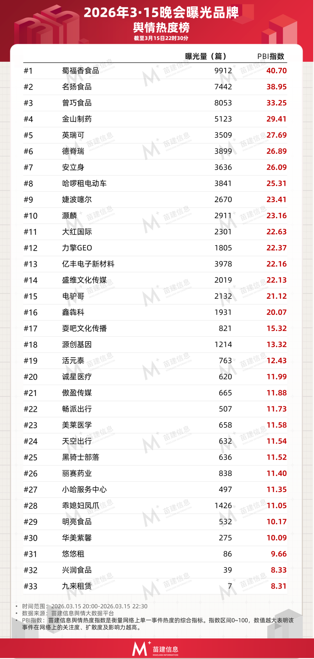 2026年315晚会共曝光品牌超30家,涉及食品加工、医美机构、增高服务、私域营销、电动自行车租赁、AI数据服务及金融服务等多个行业。从舆情表现来看,食品安全相关企业关注度最高。其中,蜀福香食品以9,912篇曝光量和40.70的舆情热度指数位居榜首,成为舆论关注焦点;名扬食品以7,442篇曝光量和38.95的舆情热度指数位列第二;曾巧食品曝光量达8,053篇,舆情热度指数为33.25,排名第三。涉食品安全企业舆情热度显著高于其他行业。