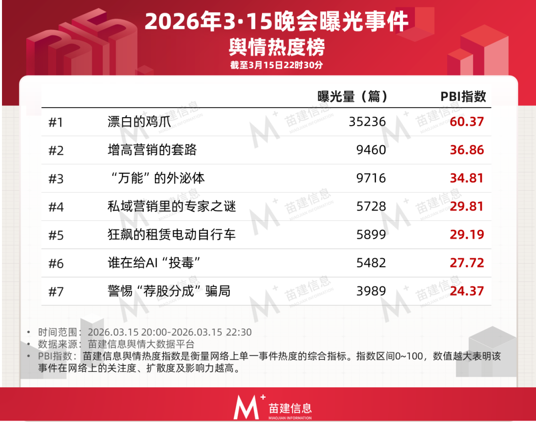 2026年315晚会曝光事件涵盖食品安全、大健康、互联网、服务业、金融等领域,包括——漂白的鸡爪、"万能"的外泌体、增高营销的套路、私域营销里的专家之谜、狂飙的租赁电动自行车、谁在给AI"投毒"、警惕"荐股分成"骗局——7个话题。从全网声量和舆情热度指数来看,食品安全、增高营销的套路等传统民生话题热度较高,AI数据安全等新兴议题亦受到广泛关注。