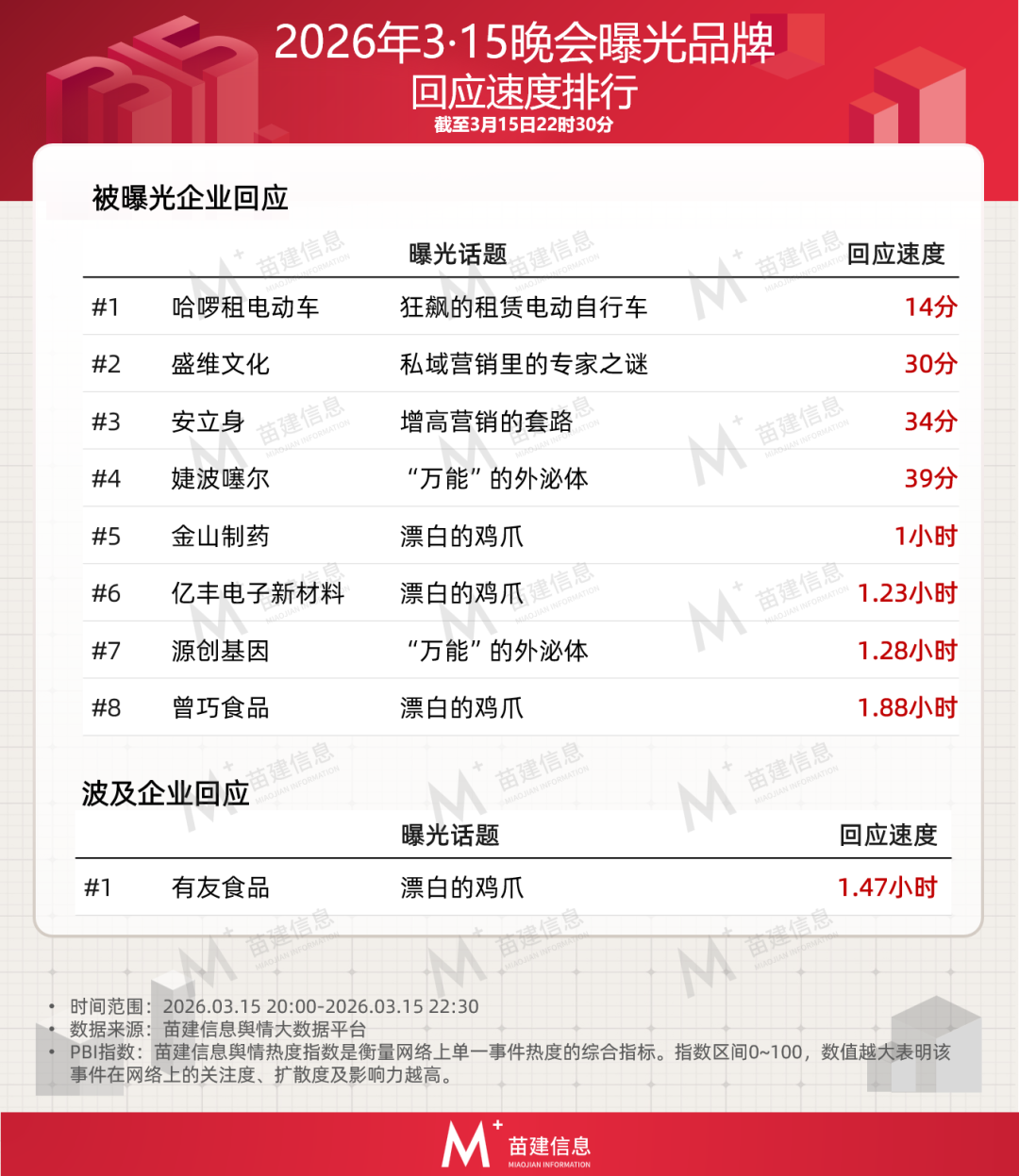 截至22点30分,共有8家曝光企业及1家波及企业作出回应。其中,哈啰租电动车回应最为迅速,仅用14分钟即发布声明,盛维文化、安立身、婕波噻尔紧随其后,均在40分钟内完成回应;金山制药、亿丰电子新材料、源创基因、曾巧食品回应时间在1至2小时之间。波及企业有友食品亦在1.47小时跟进回应。今年涉事企业回应速度较为积极,多数企业选择在晚会播出后第一时间通过官方渠道发声,舆情应对意识明显提升。