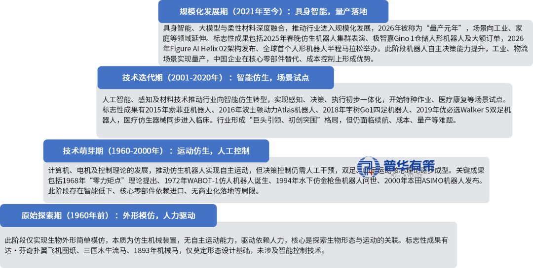 仿生机器人的发展历程,本质是“人类对生物运动机制的认知不断深化、技术不断迭代”的过程,结合技术成熟度与行业发展特征,可分为四个阶段,各阶段核心突破与标志性成果清晰,具体如下: