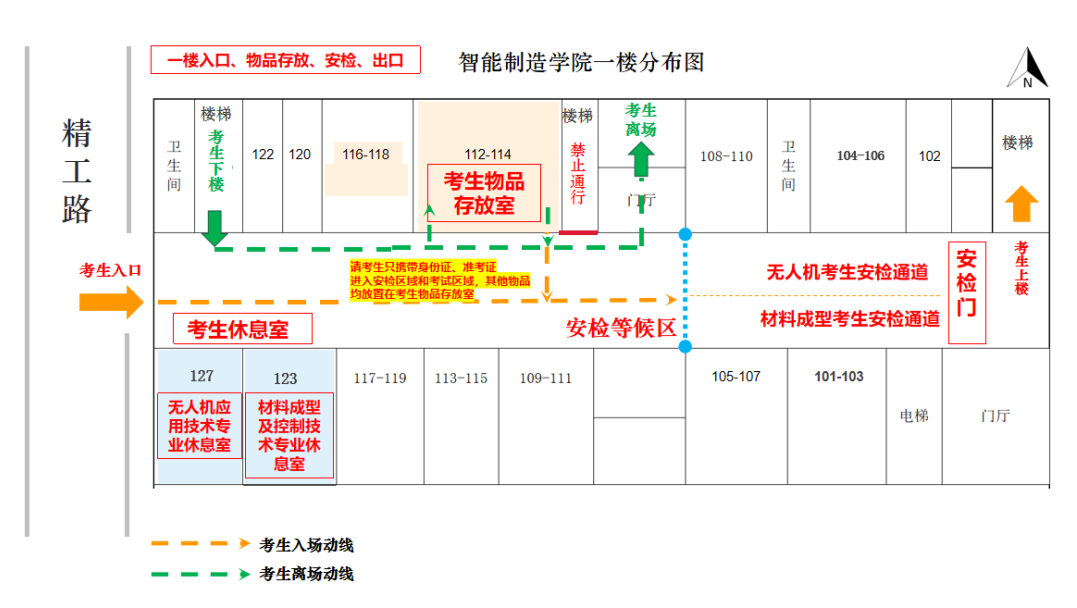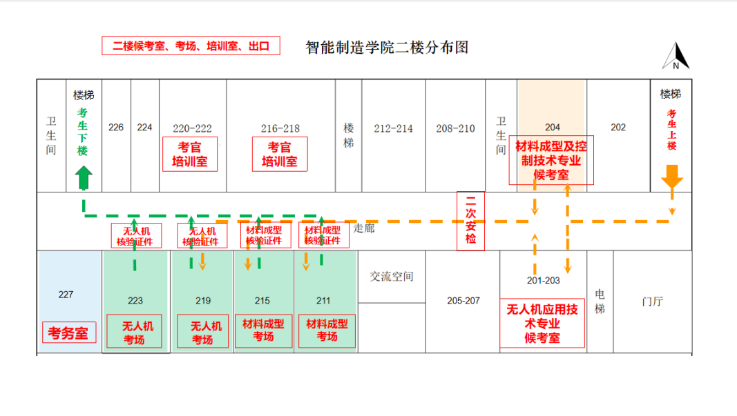 物品存放完毕后进入安检等候区,现场工作人员将核验考生身份证、准考证,使用金属探测仪和安检门进行安检。通过后请从东侧楼梯上至二楼,进入各自专业候考室:无人机应用技术专业候考室(201—203教室);材料成型及控制技术专业候考室(204教室)。