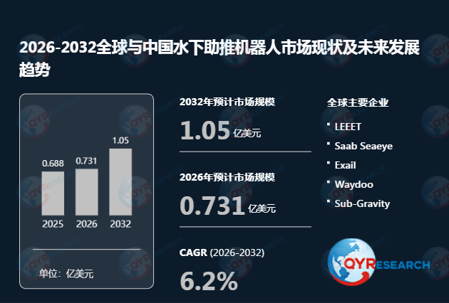根据QYR(恒州博智)的统计及预测,2025年全球水下助推机器人市场销售额达到了0.69亿美元,预计2032年将达到1.05亿美元,年复合增长率(CAGR)为6.2%(2026-2032)。