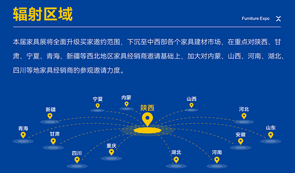 本届家具展全面升级买家邀约范围,下沉至各个家具建材市场,在重点对陕西、甘肃、宁夏、青海、新疆等西北地区家具经销商邀请基础上,加大对内蒙、山西、河南、湖北、四川等地家具经销商的参观邀请力度。