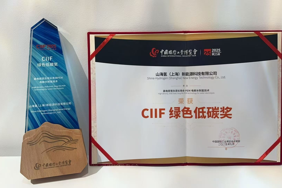 近日,在2025中国国际工业博览会(工博会)上,山海氢公司凭借“高电密宽负荷长寿命PEM电解水制氢技术”,成功斩获“绿色低碳奖”!这一荣誉不仅是对山海氢技术实力的高度认可,更是中国在绿氢装备领域迈向全球领先的重要标志。