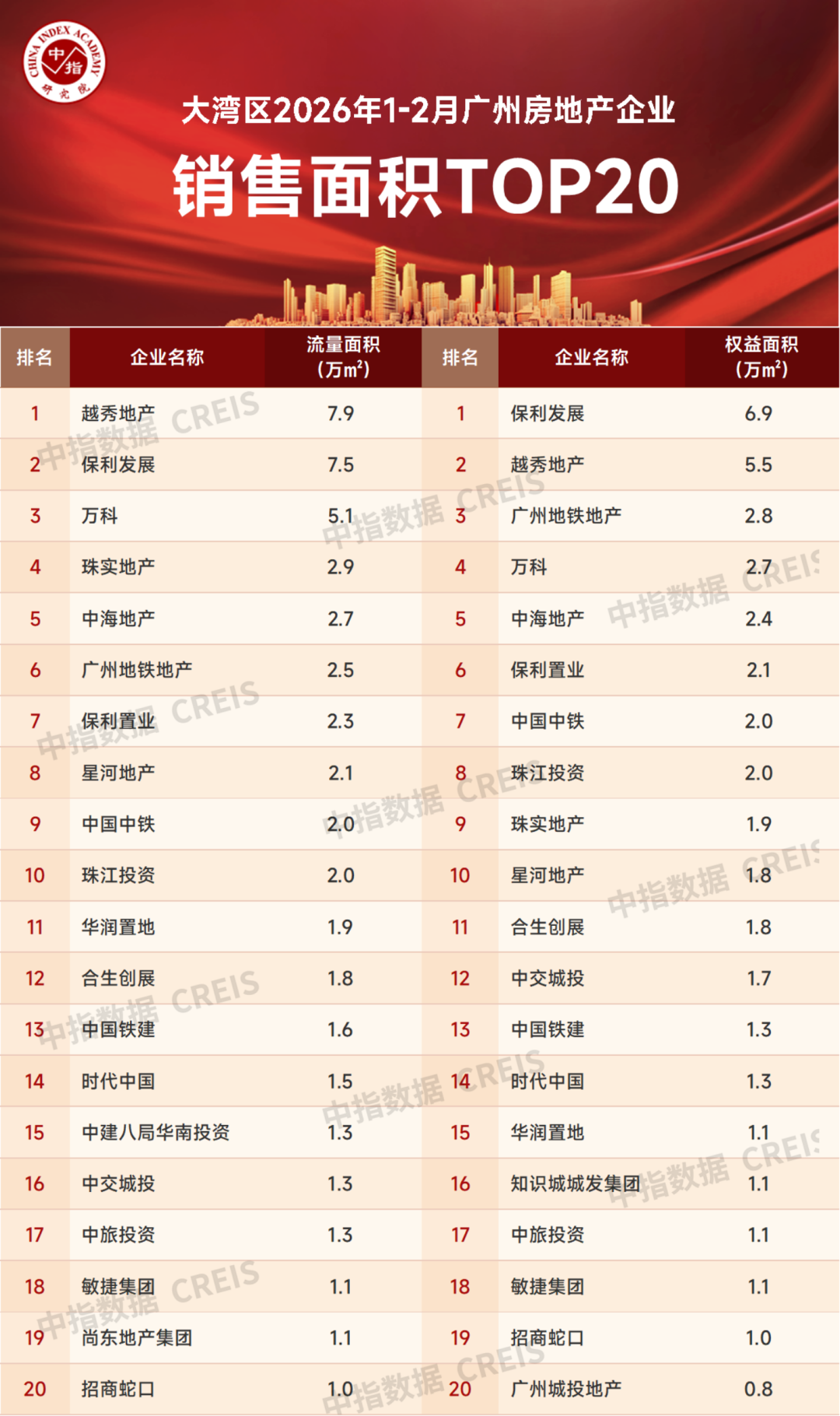 特别声明:房地产企业销售数据统计是以2026年1月1日-2月28日期间销售的商品房为统计口径,包括商品住宅、写字楼、公寓、商业全口径,主要依据中指数据CREIS(点击查看)在广州市域范围的销售监测数据,并参考当期总体经营情况和推盘去化情况进行分析统计;对于少数没有在监测范围内的企业和项目,由企业提供相关文件,经审核,也纳入统计范围。本报告仅供参考,不对使用报告及其内容所引发的任何直接或间接损失承担责任。