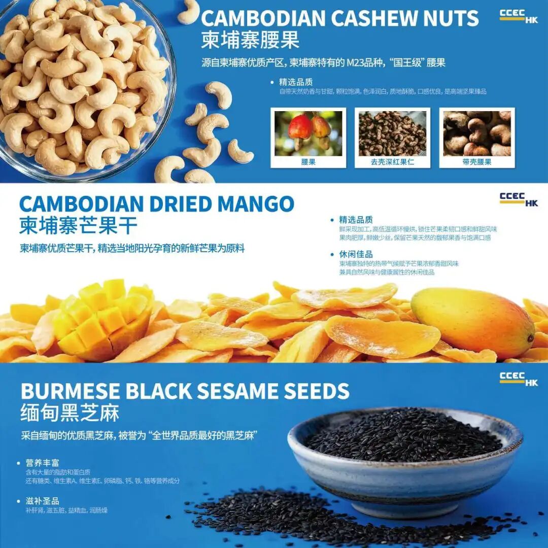 东南亚区展示的柬埔寨腰果、柬埔寨芒果干、缅甸黑芝麻都是品质精良、营养丰富的休闲佳品,其中缅甸黑芝麻被誉为“全世界品质最好的黑芝麻”。