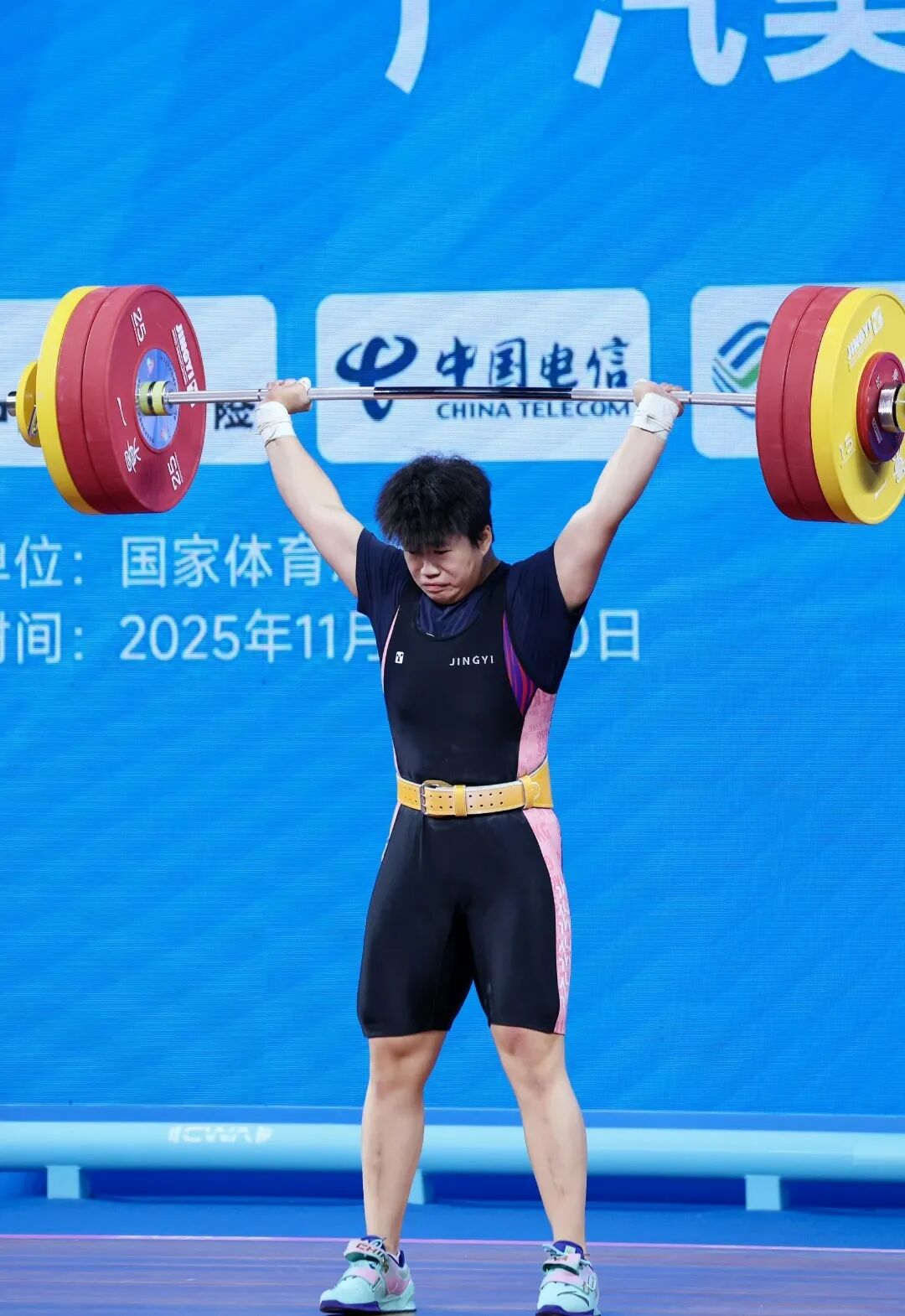 福建选手廖桂芳在女子76公斤级决赛中,在已经确保金牌的情况下继续挑战自我,以158公斤的挺举成绩刷新全国纪录并超越世界纪录,展现了中国力量的风采。