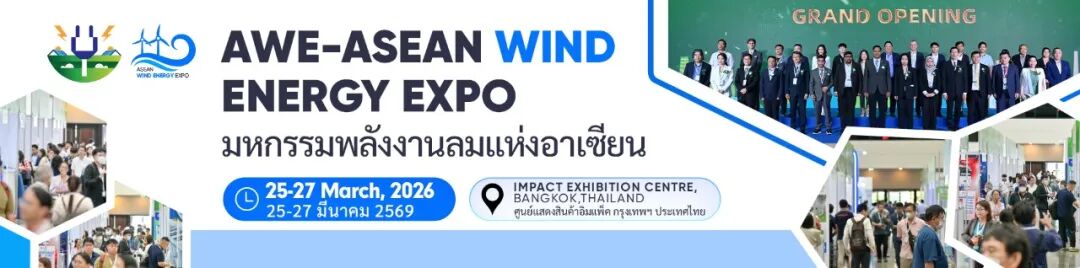 3月25日,由广东鸿威国际会展集团与泰国Compass展览集团联合主办的2026东盟(曼谷)风能博览会(AWE-ASEAN Wind Energy Expo 2026)在 泰国曼谷IMPACT展览中心 隆重拉开序幕。
