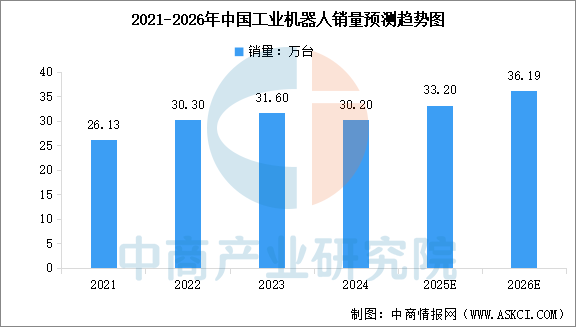 国内市场的销量经历短期调整,但中长期复苏与增长趋势明确。2024年中国工业机器人销量为30.2万台,同比小幅下降4.50%。分析师预测,2025年销量将恢复增长至33.20万台,2026年有望达到36.19万台。