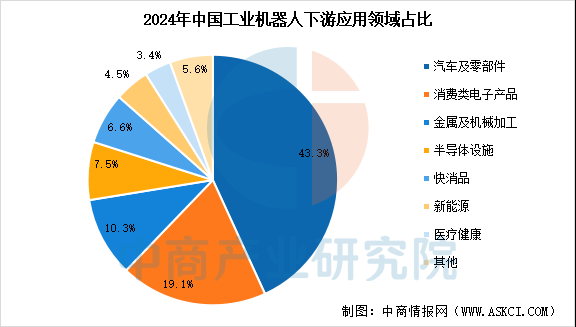 从传统应用领域来看,汽车制造、电子电气和金属加工是工业机器人的三大主要场景。根据中商产业研究院的报告,2024年汽车及零部件领域是最大应用市场,占比高达43.3%;消费类电子产品和金属及机械加工领域分别占比19.1%和10.3%。