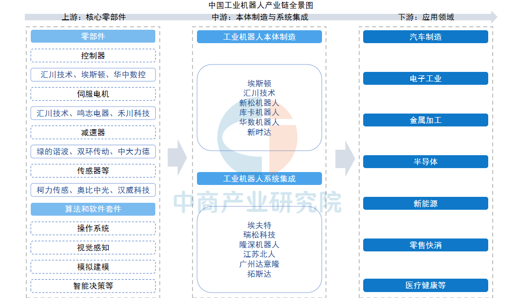 产业链中游聚焦于工业机器人的本体制造与系统集成,反映了整体市场的规模与产业动态。