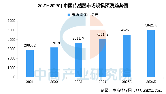 中商产业研究院发布的《2025-2030年中国智能传感器行业前景与市场趋势洞察专题研究报告》显示,2024年中国传感器市场规模为4061.2亿元,较上年增长11.43%。预计2025年市场规模将达到4525.3亿元,2026年有望增长至5042.4亿元。