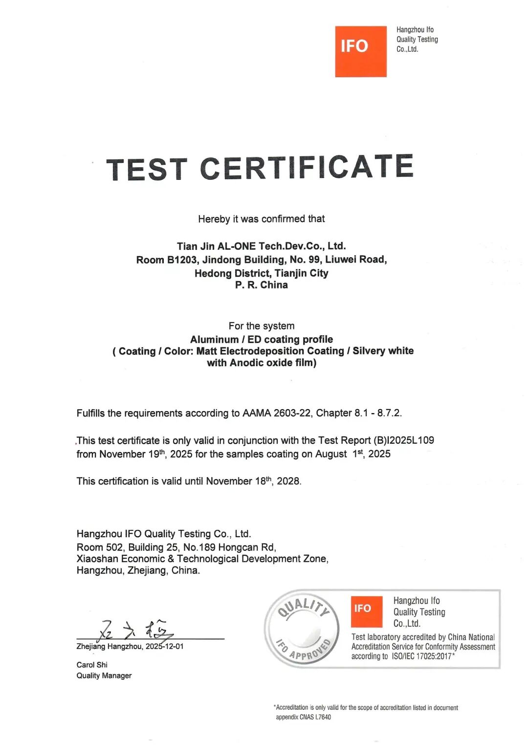 这一年,天津艾隆迎来发展历程中的重要里程碑——公司的消光电泳复合膜,成功通过最新版美国建筑制造商协会AAMA 2603-22第8.1-8.7.2章节的测试;在行业重磅评选中,申报的《建筑铝型材阳极氧化加消光电泳技术及应用》项目,成功入选“2025十大先进转化膜技术典型应用案例”;在2025年安义县招商恳谈会上,公司和江西南亚铝业达成订单合作签约;技术认证、行业认可、市场落地,均印证了公司在表面处理领域的技术硬实力。