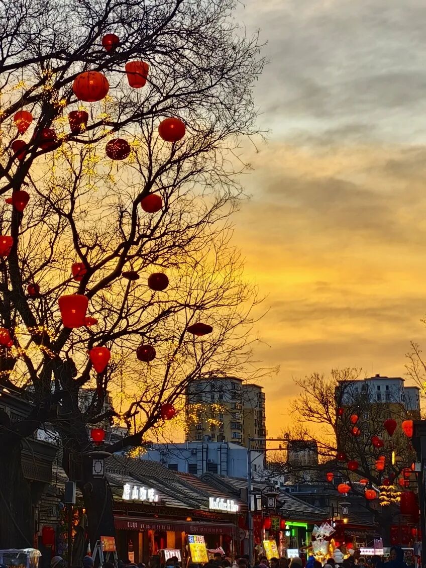 下午五点就蹲守在模式口大街!看着光秃秃的树枝🌿被红灯笼一点点点亮,暖黄色的光透过纸灯笼晕开,连空气都变得甜甜的~ 😍 傍晚的粉紫色天空当背景,笑脸灯笼随风晃悠,相机咔咔拍根本停不下来!