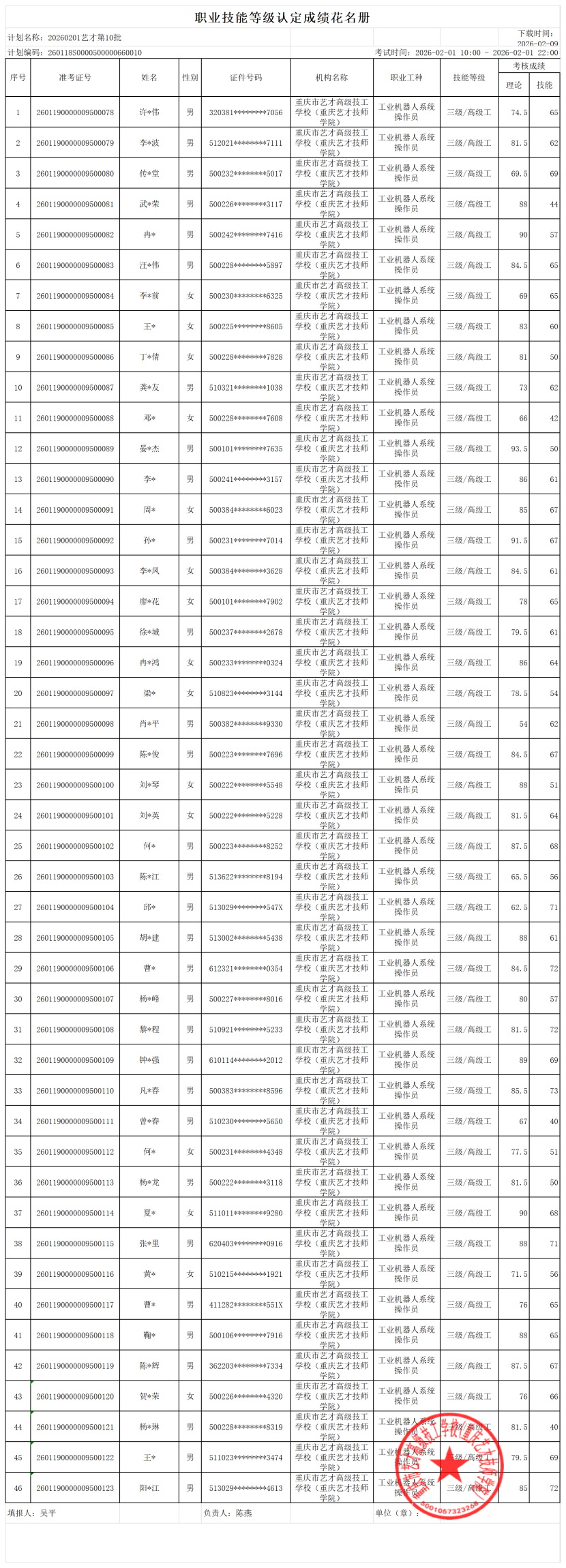 根据<<重庆市职业技能鉴定指导中心<重庆市职业技能等级认定考试考务工作规程(试行)>的通知>>(渝职鉴发[2021]23号)要求,现将20260201艺才第10批工业机器人系统操作员职业技能等级认定成绩予以公示。