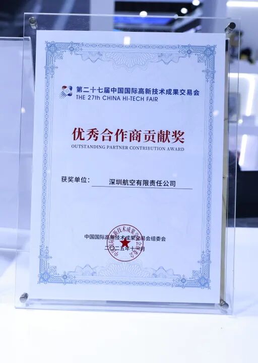 作为 “深圳国际航空枢纽唯一运营人” 与 “高交会官方指定航空服务合作伙伴”,深航受邀入驻大会 9 号 “国之重器科技巨头产业链” 展馆现场,设立专属展位,3 天吸引近 20 万人次前来展台参观,全方位展示了企业在航空科技、旅客服务与品牌创新方面的最新成果,获得市、局及组委会的高度肯定,并被授予 “优秀合作商贡献奖”。