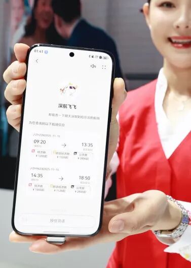 在旅客服务创新方面,深航重点展出两大便捷高效的 AI 服务亮点:与华为合作的 AI 智能体 “深航飞飞”,及深航小程序上的 VR 客舱沉浸式选座。二者以 AI 技术为核心,操作流程简洁直观,让现场嘉宾轻松解锁便捷参与方式,沉浸式感受航空科技的魅力。