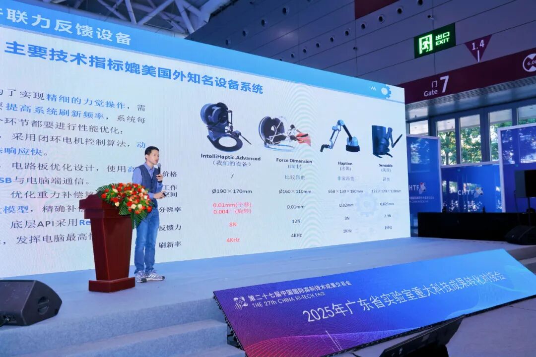 会上,实验室力触觉反馈装置与多通道融合人机交互平台团队重点介绍了实验室自主研发的重大科技成果——智能触觉六自由度力反馈器(IntelliHaptic)。该成果是实验室在智能交互与力觉交互关键技术领域取得的重大突破。作为目前国内唯一具有完全自主知识产权的高端力反馈设备,智能触觉六自由度力反馈器凭借其卓越性能与创新设计,填补了国内相关技术空白,并在虚实融合高沉浸式场景中展现出广阔的应用前景,为产业升级和创新发展提供了有力支撑。