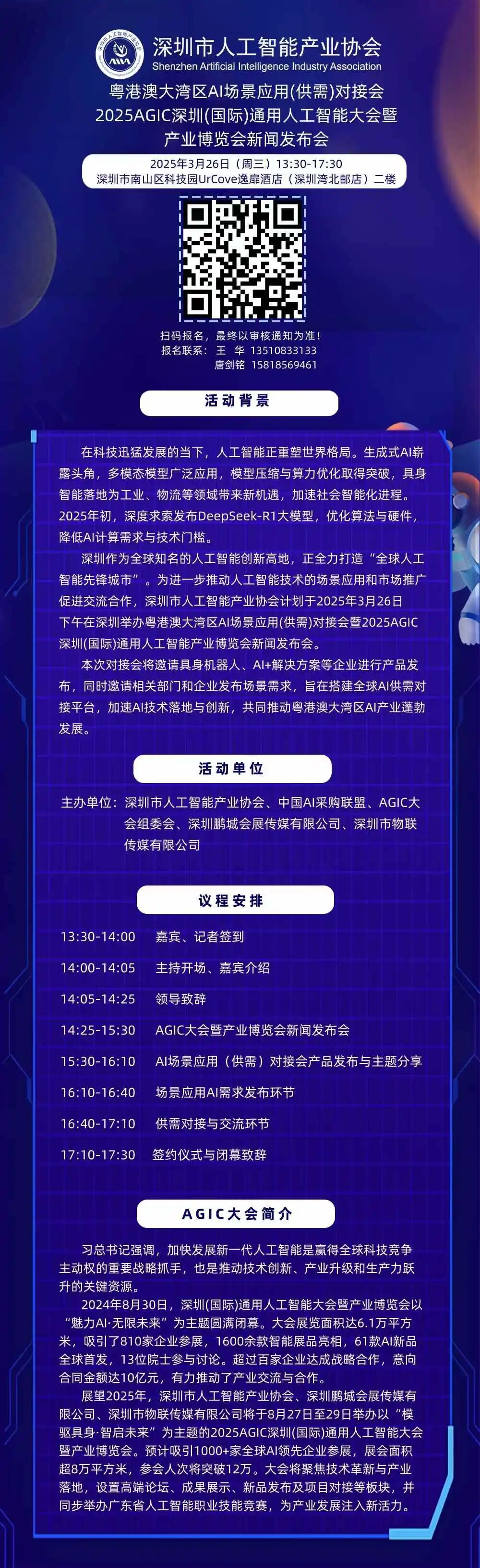 为进一步推动人工智能技术的场景应用和市场推广促进交流合作,深圳市人工智能产业协会计划于2025年3月26日下午13:30-17:30深圳市南山区科技园UrCove逸扉酒店(深圳湾北邮店)二楼,举办粤港澳大湾区AI场景应用(供需)对接会。