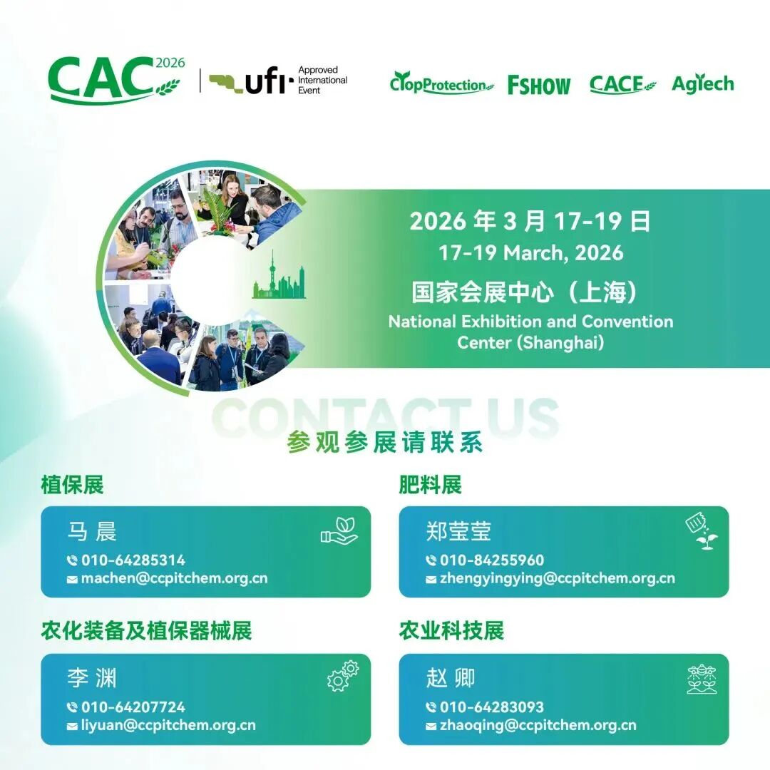 CACE2026作为专业化、国际化的平台,依托CAC全球顶级资源,精准覆盖130多个国家和地区的农化采购网络,为企业开拓与深耕全球业务提供高效渠道,为近400家展商创造与海内外近1800家农药、肥料展商同频共振、协同发展的舞台。CACE2026精准聚焦四大板块,全面展示产业链上下游创新成果。