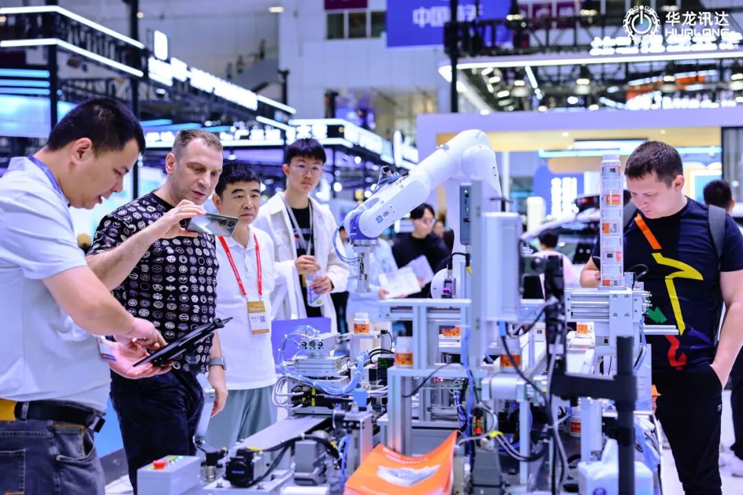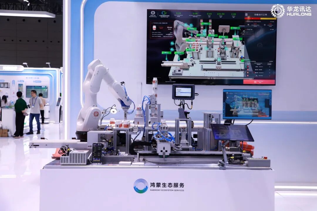 华龙讯达展台的“具身智能生产线”集成了华龙讯达自主可控大型PLC、华龙工鸿、AI视觉传感系统以及运动控制系统等技术。