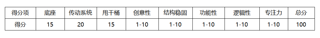 (1)完成底座的搭建得15分;完成传动系统的搭建得20分;完成甩干桶的搭建得15分;