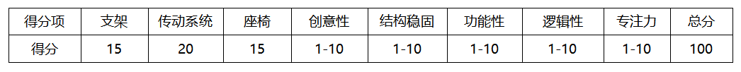 (1)完成支架的搭建得15分;完成传动系统的搭建得20分;完成座椅的搭建得15分;