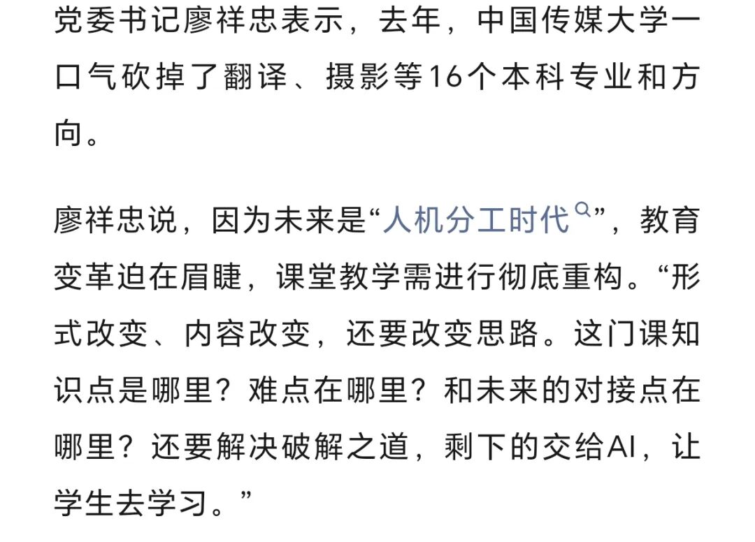 去年中国传媒大学砍掉了16个本科专业,就是因为AI的冲击。书记廖祥忠说:“教育改革也迫在眉睫”。
