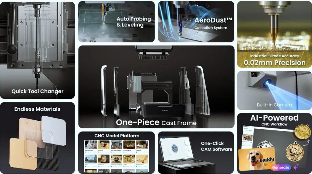 他们这台桌面CNC,精度做到了0.02毫米,比市面上同类产品高出3到5倍。能切割金属、木材、亚克力等多种材质,还支持自动调平、自动换刀、自动除尘——听起来像是把工业级的功能,硬塞进了一台放在书桌上就能用的设备里。