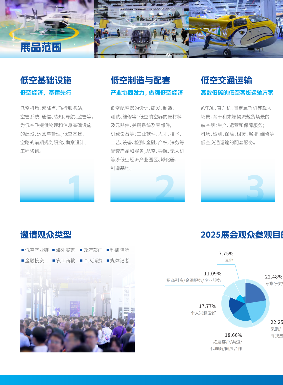通过展览展示,会议论坛,飞行演示,奖项评选,商业路演,直播专访等多种形式,为参展商深度链接上下游精准客群,联动多类生态伙伴合作,集聚低空发展所需的金融、人才、技术、标准、政策等生态要素。