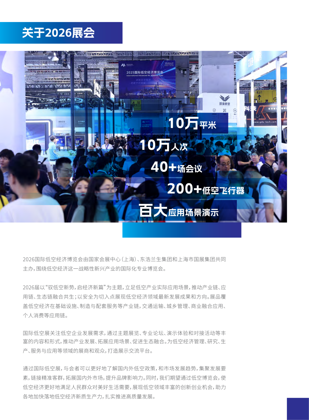 2026国际低空经济博览会由国家会展中心(上海)、东浩兰生集团和上海市国展集团共同主办,围绕低空经济这一战略性新兴产业的国际化专业博览会。