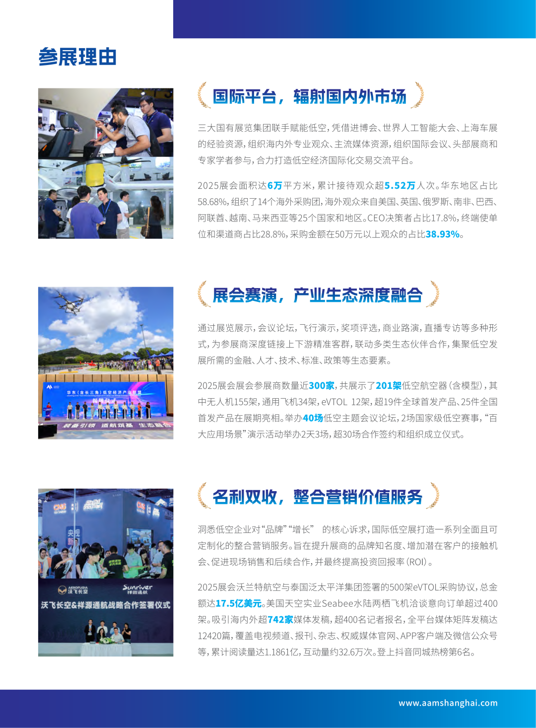 通过国际低空展,与会者可以更好地了解国内外低空政策,和市场发展趋势,集聚发展要素,链接精准客群,拓展国内外市场,提升品牌影响力。同时,我们期望通过低空博览会,使低空经济更好地满足人民群众对美好生活需要,展现低空领域丰富的创新创业机会,助力各地加快落地低空经济新质生产力,扎实推进高质量发展。