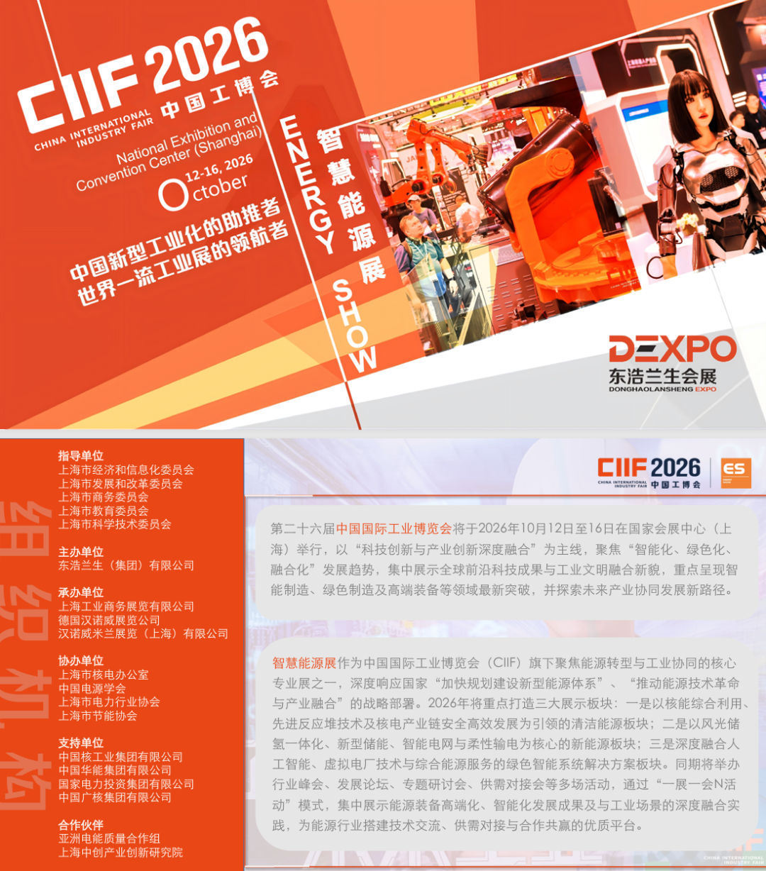 第二十六届中国国际工业博览会(CIIF 2026)智慧能源展,将于2026 年 10 月 12 日 - 16 日在 ** 国家会展中心(上海)盛大启幕!作为中国工博会旗下聚焦能源转型与工业协同的核心专业展,本次展会以“科技创新与产业创新深度融合”** 为主线,聚焦 “智能化、绿色化、融合化” 发展趋势,集中展示全球前沿科技成果与工业文明融合新貌,重点呈现智能制造、绿色制造及高端装备等领域最新突破,探索未来产业协同发展新路径,是中国新型工业化的助推者,更是世界一流工业展的领航者。