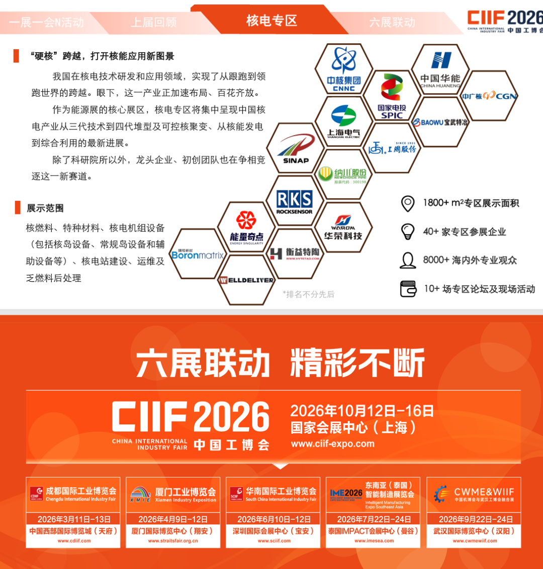 核能综合利用、先进反应堆技术及核电产业链安全高效发展为引领,集中呈现我国核电产业从三代技术到四代堆型、可控核聚变、从核能发电到综合利用的最新进展,打造 1800+㎡核电专属展区,汇聚 40 + 家头部参展企业,带来核电技术研发、核燃料、特种材料、核电机组设备等全链条前沿成果。