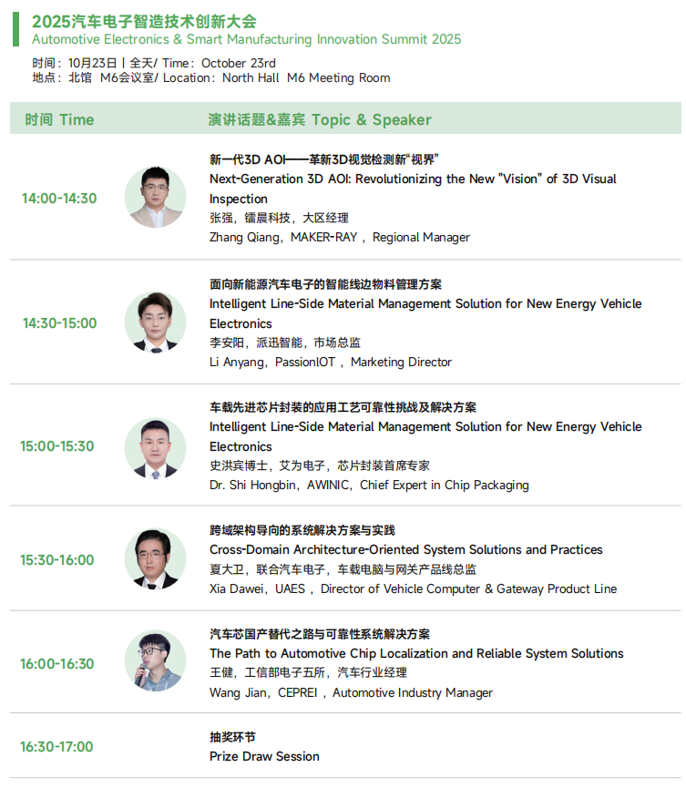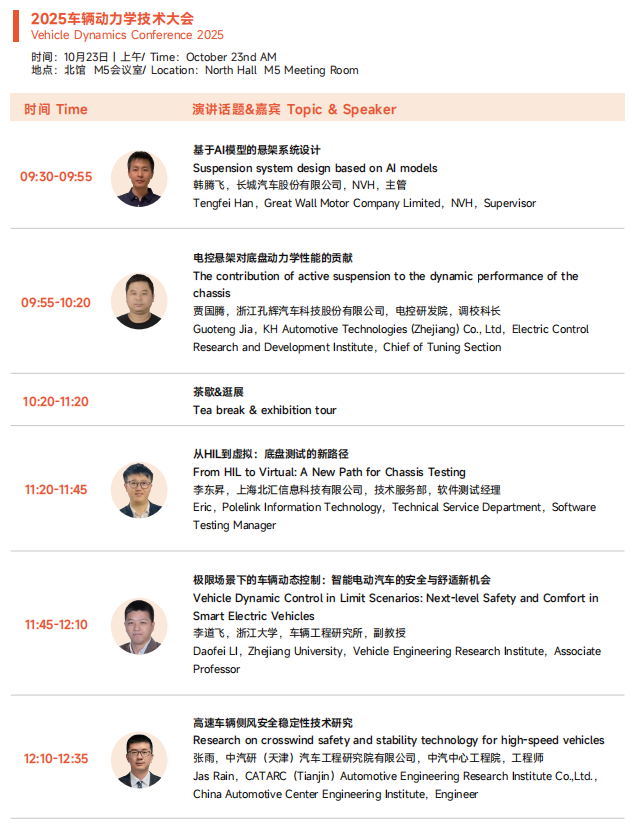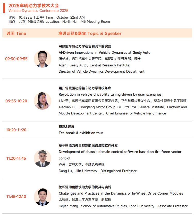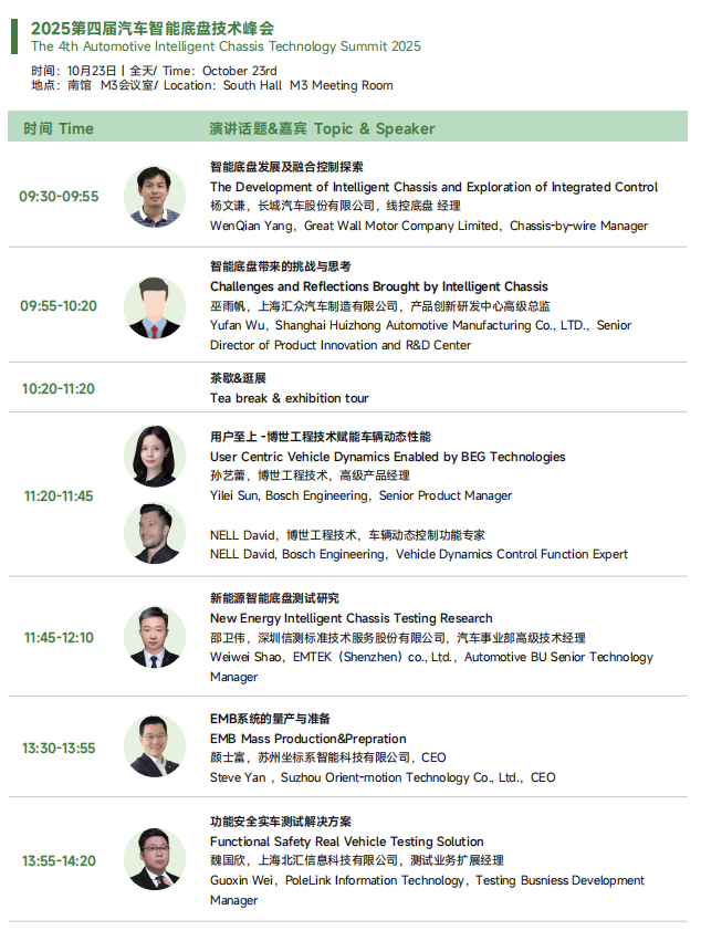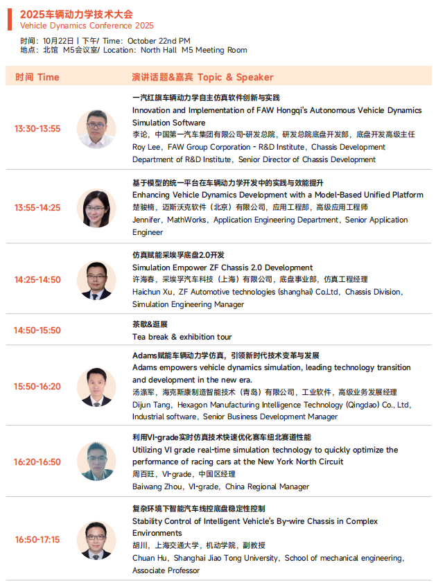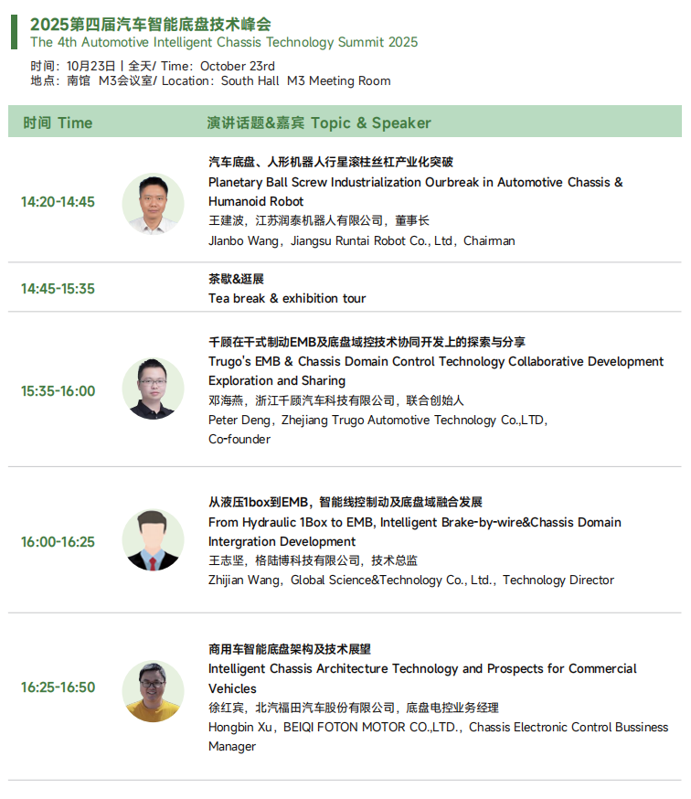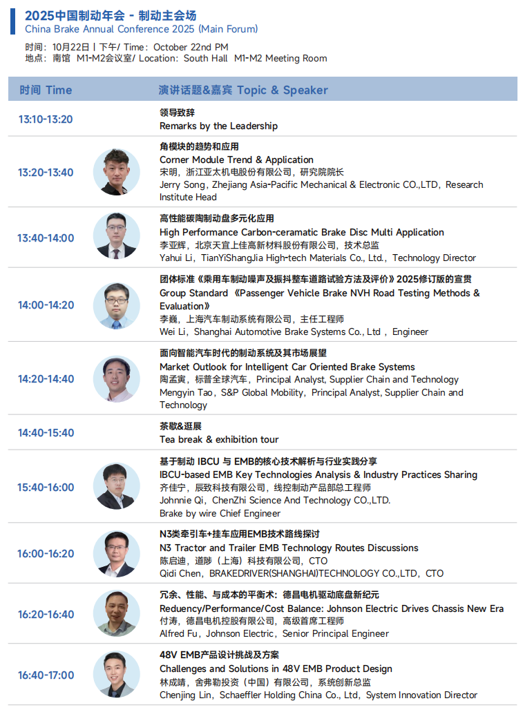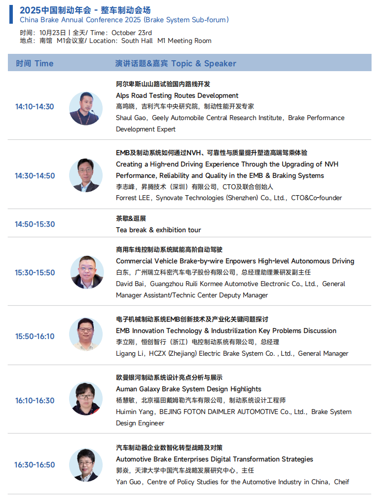 2025展会将为大家展现更为丰富的应用展示和内容,热点技术话题全面覆盖智能底盘、制动总成、悬架总成、转向总成智能制造等等汽车底盘系统领域。本届展会展览面积28,000平,超过400+参展商,20,000+专业观众观展。同期举办六大品牌技术会议,超过200+技术热点及话题,3000+人士,其中主机厂人士超30%。