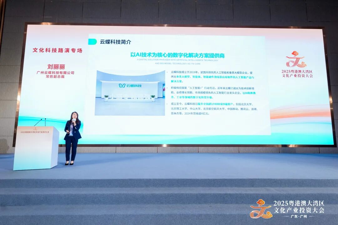 11月26日,2025粤港澳大湾区文化产业投资大会(简称“大湾区文投会”)在广州黄埔开幕。本届大湾区文投会以“文化+科技+金融”深度融合为核心,为期3天的活动吸引了120多家投资机构、330多家文化企业主要负责人参会。云蝶科技常务副总裁刘丽丽博士受邀出席,并在文化科技路演专场中,向与会嘉宾深度推介企业创新成果。