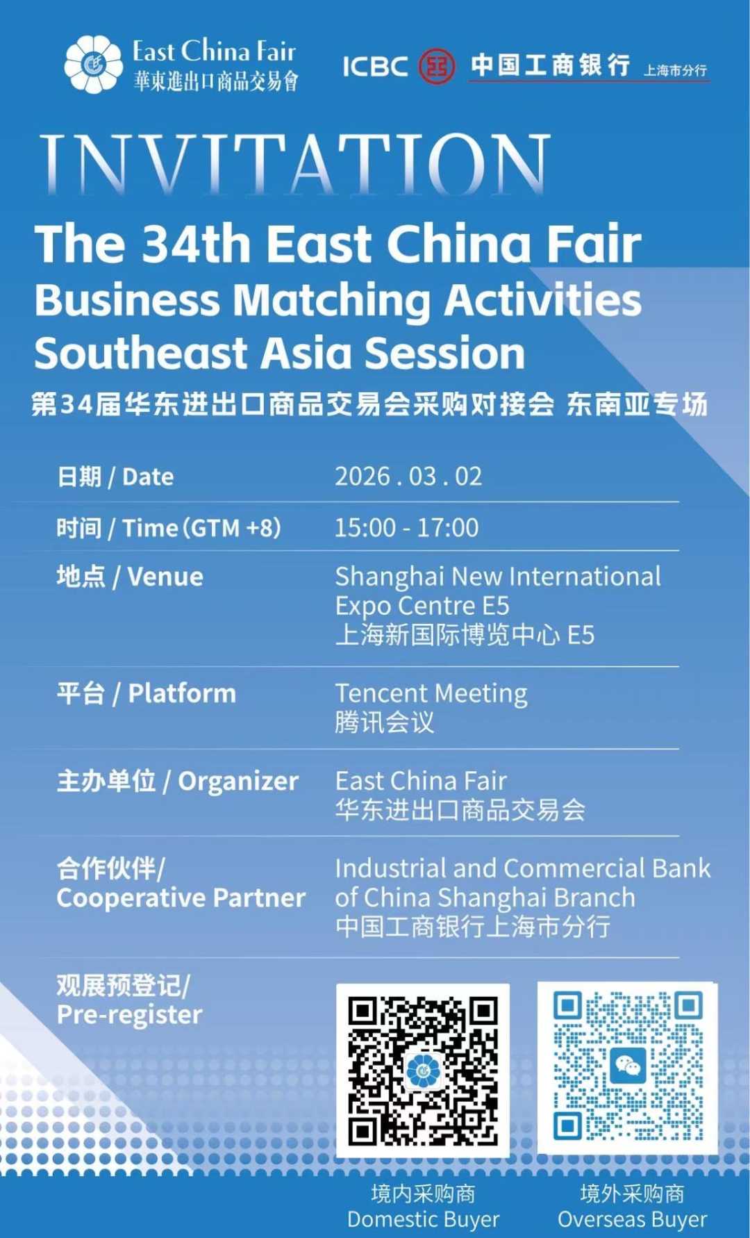 工行上海市分行将于3月2日下午(15:00-17:00)在展会现场承办东南亚专场采购对接会,充分发挥集团全球布局优势,联动集团东南亚地区境外机构,邀请来自日本、韩国、泰国、马来西亚、柬埔寨、印尼等国家的近30家境外采购商,精准匹配境内近百家优质参展企业,通过线上线下结合的方式开展近200轮次磋商对接,助力境内展商开拓国际市场。