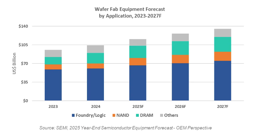 预计到2025年,晶圆代工和逻辑应用领域的晶圆厂设备(WFE)销售额将实现强劲的同比增长,达到9.8%,规模达666亿美元,这主要得益于先进制程节点的持续强劲增长。随着芯片制造商增加人工智能加速器、高性能计算和高端移动处理器的产能,预计该领域在2026年将增长5.5%,并在2027年增长6.9%,达到752亿美元。随着行业向2纳米环栅(GAA)制程节点的大规模量产转型,投资将日益集中于前沿技术。