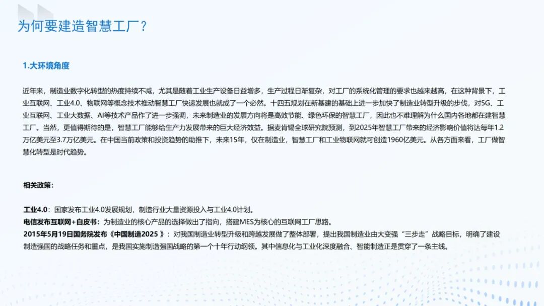 2024 年,工业和信息化部等六部委联合开展智能工厂梯度培育行动,将智能工厂划分为基础级、先进级、卓越级和领航级四个层级,通过分级培育、精准扶持构建完善的发展体系。这一政策不仅明确了智慧工厂的建设标准,更通过评审认定、技术推广等举措,引导资源向智能化转型企业倾斜。