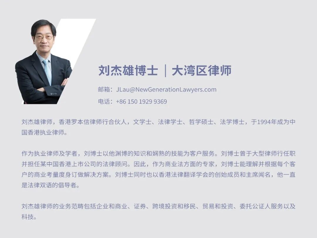刘杰雄博士是执业逾30年的资深律师,现为青狮云岸律师事务所大湾区律师,中国香港罗本信律师行合伙人。刘博士的职业轨迹横跨中国香港、内地及普通法系地区(澳大利亚、新西兰、英国)。作为执业律师及学者,刘博士不仅持有香港、澳洲新南威尔士州及英格兰与威尔士的律师资格,更荣获中国政法大学法学博士学位,兼具深厚的普通法与大陆法素养。