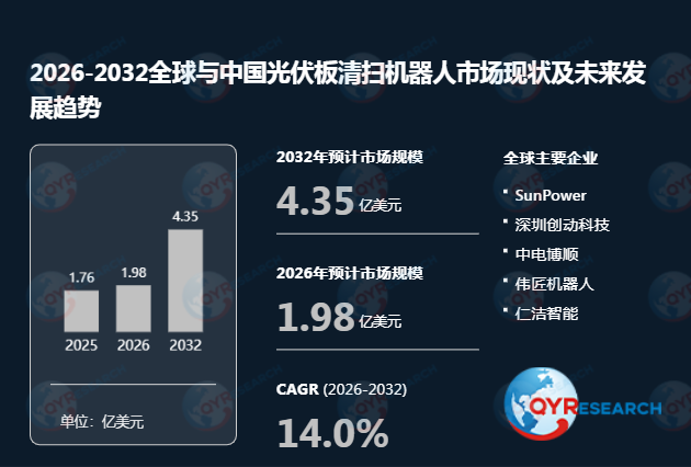根据QYR(恒州博智)的统计及预测,2025年全球光伏板清扫机器人市场销售额达到了1.76亿美元,预计2032年将达到4.35亿美元,年复合增长率(CAGR)为14.0%(2026-2032)。