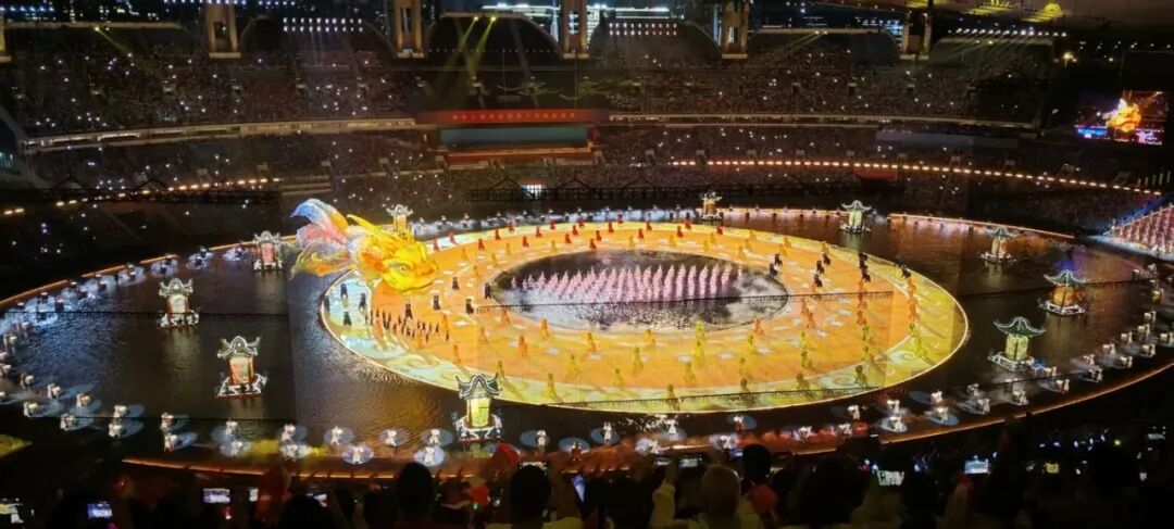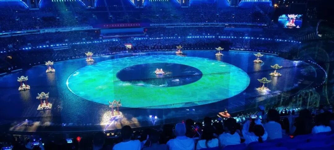 十五运会开幕式上,巧妙运用九块异形屏幕与环形舞台,打造出一场视觉盛宴。面对环形舞台留给视频面积有限的条件,项目团队化限制为优势,充分利用环形结构营造的空间感与纵深感,实现了层次丰富的裸眼3D视觉效果。在《岭南春早》节目中,项目团队借助地面环形屏幕构建出“水舞台”意象,通过视觉下沉效果,形成了悬浮舞台的独特空间。九块异形屏幕的透明属性与分割状态,不再被当作整块屏幕使用,而是强调变化和运动,展现出更空灵的艺术表现。