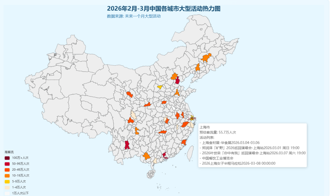 在未来一个月(2026年2月9日至3月9日)内,共梳理出55项大型活动,涵盖展会、体育赛事、马拉松、演唱会、网红IP及节假日六大类别。总预计观众/参与人数超过600万人次(仅统计有明确数据的活动)。主要分布省份:上海、广东、四川、江苏、北京、浙江等。活动高峰时段:2月中旬(春节前后)及3月初(元宵后复工期)。