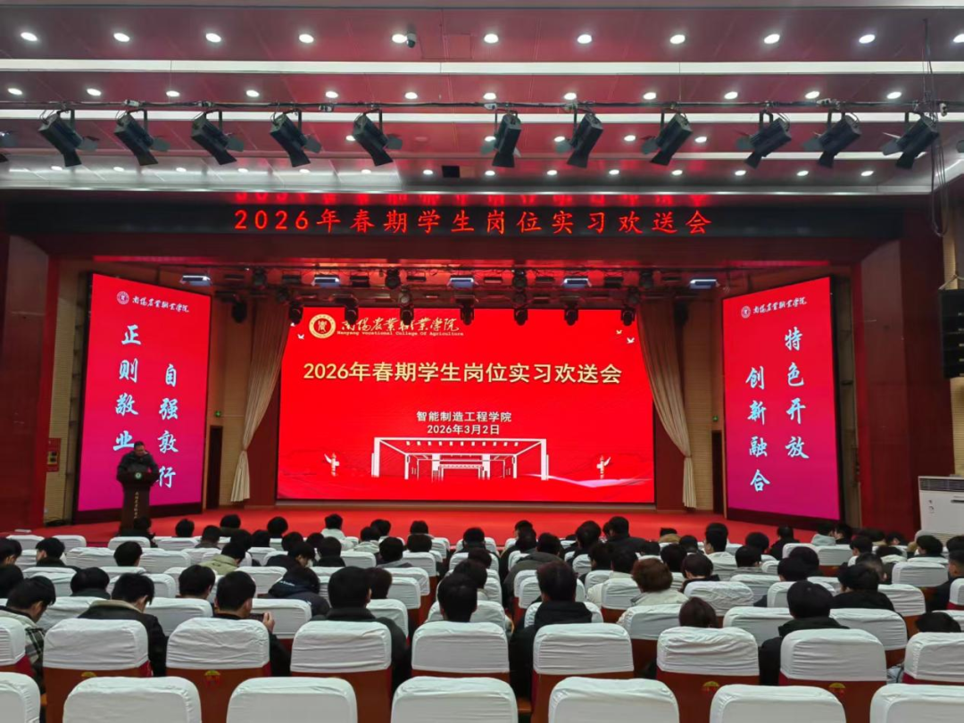 3月2日上午,智能制造工程学院在雪枫校区第一学术报告厅举行2026年春期学生岗位实习欢送会,为即将赴浙江长江汽车电子有限公司实习的23级机电1班、3班、5班共137名学生送行。学院党总支书记李凡空、副院长王伟及相关班主任参加,会议由王伟主持。