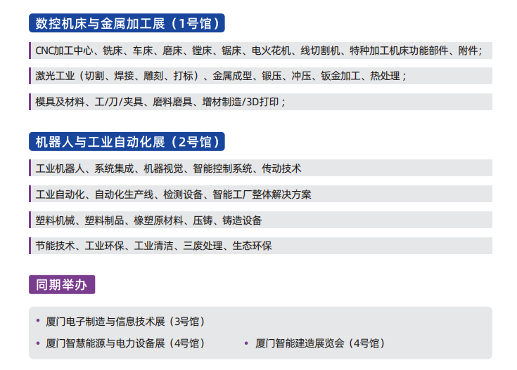 展会内容涵盖机器人与工业自动化、金属加工、新能源、智能建造等 8 大核心领域,从小小的零部件到完整的系统解决方案,全产业链一站式覆盖。同期还将联动厦门电子信息暨数字经济博览会、厦门新能源新材料产业展览会等 4 大专题展!​