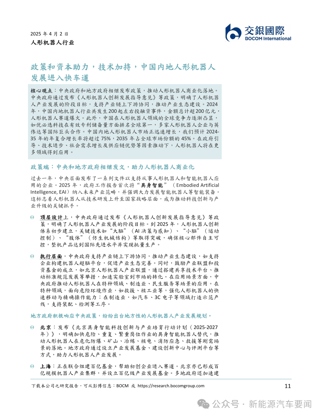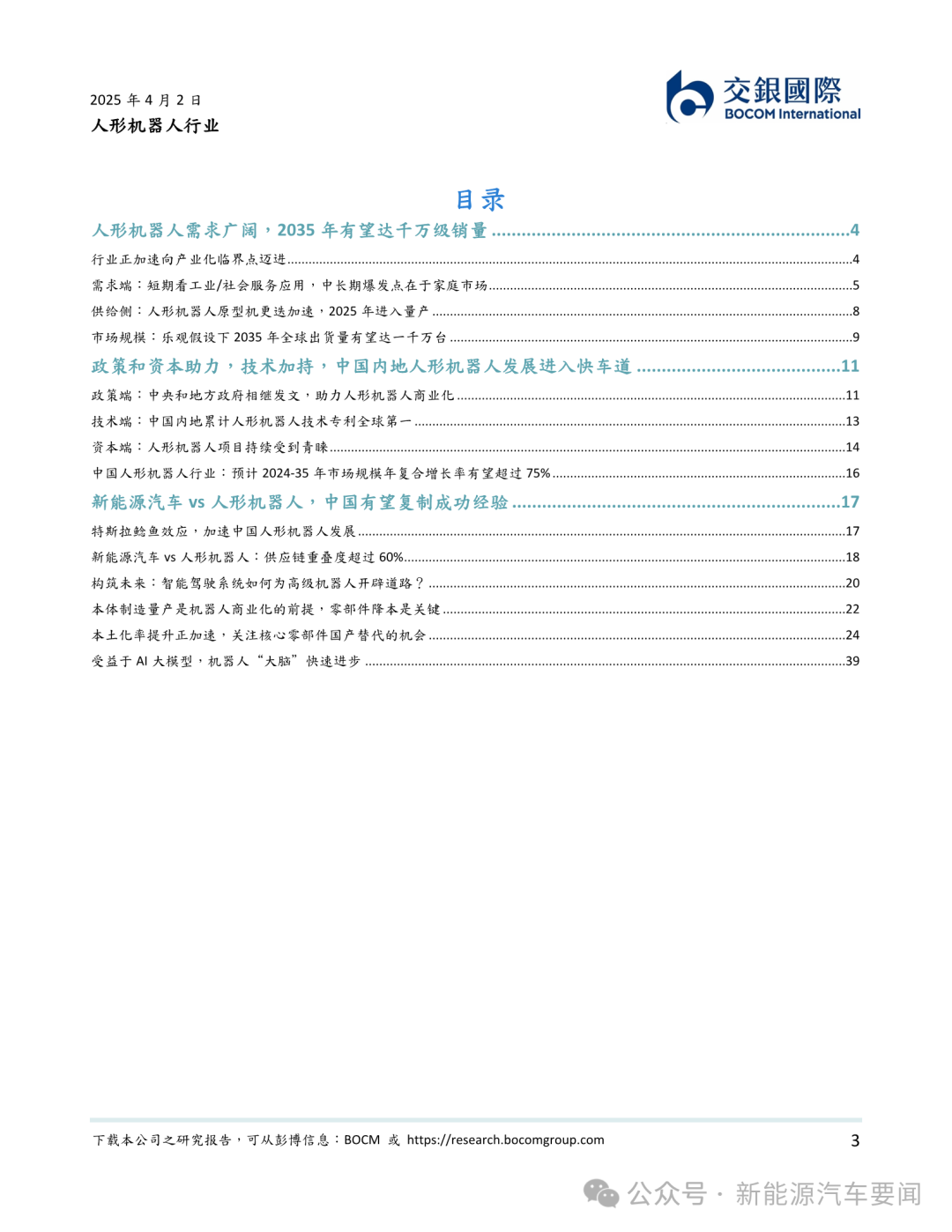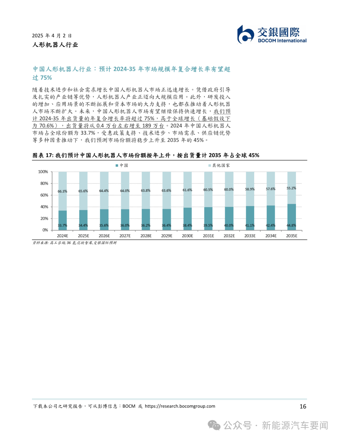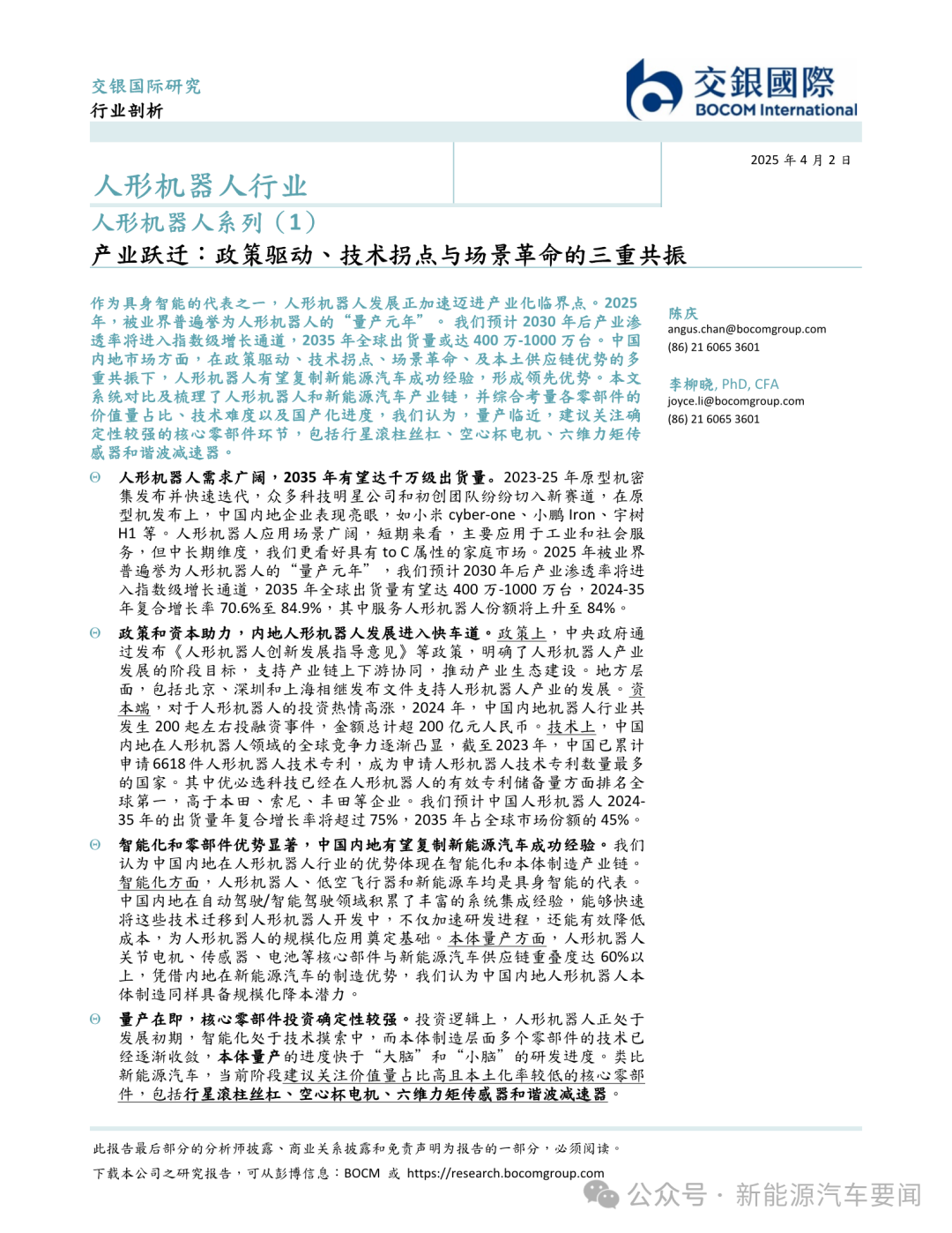 作为具身智能的代表之一,人形机器人发展正加速迈进产业化临界点。2025年,被业界普遍誉为人形机器人的“量产元年”。 我们预计2030年后产业渗透率将进入指数级增长通道,2035 年全球出货量或达400万-1000万台。中国内地市场方面,在政策驱动、技术拐点、场景革命、及本土供应链优势的多重共振下,人形机器人有望复制新能源汽车成功经验,形成领先优势。本文系统对比及梳理了人形机器人和新能源汽车产业链,并综合考量各零部件的价值量占比、技术难度以及国产化进度,我们认为,量产临近,建议关注确定性较强的核心零部件环节,包括行星滚柱丝杠、空心杯电机、六维力矩传感器和谐波减速器。