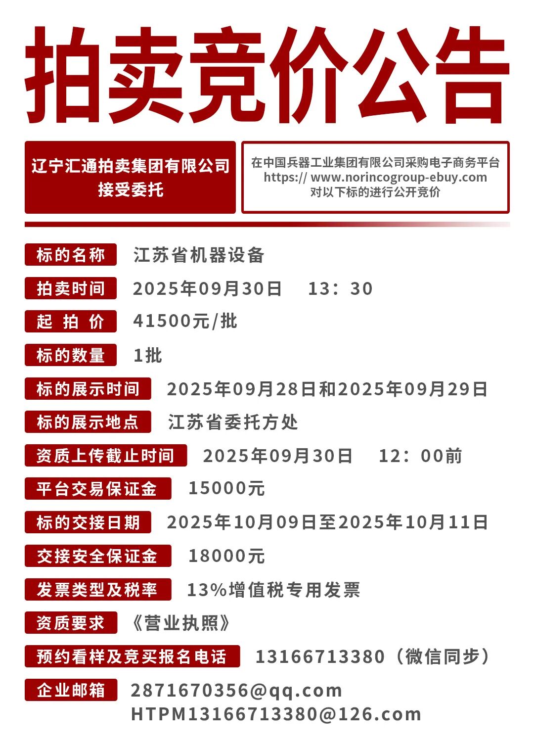 2025年09月30日 江苏省机器设备拍卖竞价公告
