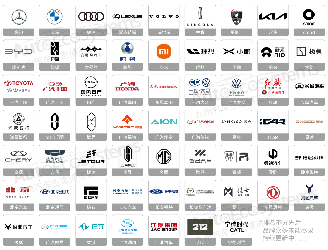 奔驰、宝马、奥迪、雷克萨斯、沃尔沃、林肯、罗伦士、起亚、smart、比亚迪、仰望、方程豹、腾势、小米、理想、小鹏、蔚来、极氪、一汽丰田、广汽丰田、东风日产、广汽本田、东风本田、一汽大众、上汽大众、红旗、长城、鸿蒙智行、AITO问界、智界、广汽昊铂、广汽埃安、广汽传祺、领克、ICAR、星途、奇瑞、吉利、捷途、尚界、名爵、智己、荣威、零跑、捷途纵横、北京汽车、北京现代、极石、长安汽车、福特、长安马自达、猛士、东风风神、岚图、极狐、广汽领程、奕派、上汽通用、江汽集团、212、宁德时代等,现场展示新能源改装车、超跑、豪华定制车、品牌性能车、国内外顶级改装车品牌、主流在售车的改装版/共创版车型及官方性能套件等超千款年度重磅车型,满足新消费群体个性化和差异化的汽车消费需求。