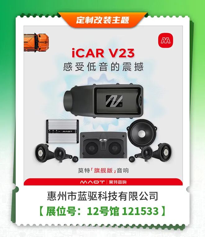 同时该主题展区还有5400余家知名改装品牌,聚焦汽车个性化升级热门趋势,品类覆盖:汽车内外改装升级、轮胎轮毂、性能部件、赛事文化、越野改装、汽车电子、汽车影音、汽车全膜、内饰精品、电商连锁等品类,全方位展示年度汽车改装新生态。