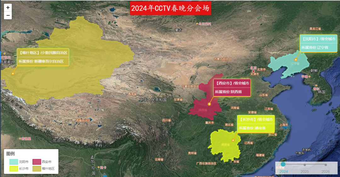 2024 年是甲辰龙年,春晚分会场首次采用 “1+4” 模式,选址辽宁沈阳、湖南长沙、陕西西安、新疆喀什,确立了 “地理均衡 + 文化地标” 的核心逻辑。